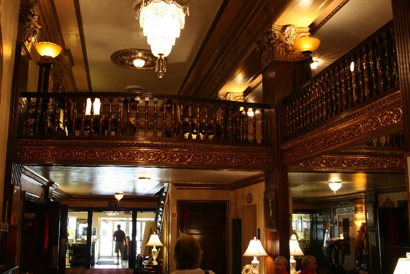 But guess who is still up front leading the way! Why it is Jim Woestman, the Rt 66 rally Master. Originally, only Denny and Stephen were were going to caravan on to the Four Corners rally in Colorado, but during the course of this rally we convinced Jim to join us. He then lead us the rest of the way to Tulsa on Rt 66 and then we jumped on the freeway and the three of us caravaned for the next three days the rest of the way to Colorado. See the Four Corners album for "the rest of the story". | We had a late lunch at the only remaining Ku Ku fast food place. It has ku ku or coo coo clocks as it's main theme. This was the official end of the Route 66 rally and the Clugstons headed back north towards home. | This is a view of the upper lobby area. Visit www.colemantheater.com for more information. If we had time, we would have stayed for the evening performance. | This chandelier was missing and has now been recovered. The restoration of the theatre has been very well done. | ||