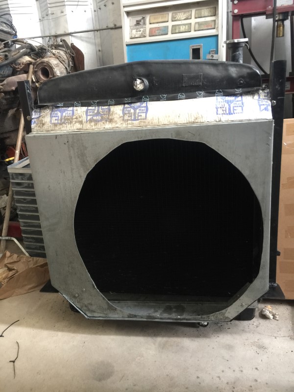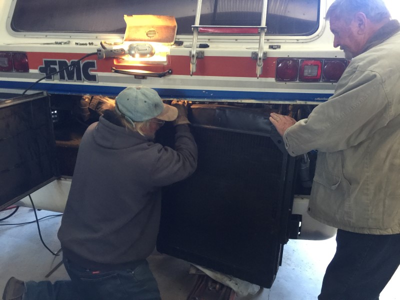 The larger diameter fan required that the radiator be lower that it's previous position. The transmission coolers are now higher up and more centered on the fan. The coach was then buttoned up and ready to roll. The temperature gauge has not moved since even on steep, long grades so this is the last of the steps to the Dieselfication of 1046! | Here Bill is finishing up securing the new radiator in place. | (1 Comments) This was being done at Bill Sitton's place in Ignacio, CO as he is a mechanic, has several FMC coaches and has all the tools needed. He is on the left and Larry Enoksen, on the right, is helping. | Next we reworked the fan shroud to adapt it to the new fan and new radiator. I went back to an original FMC brass radiator. That had the advantage of a better lineup of the fill spout on the radiator with the opening in the back of the coach. | ||