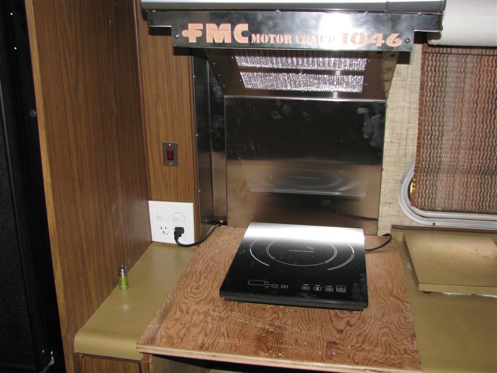 ... like this or one on this side of the coach and one on the other side of the coach. | I have two burner units so I can use them like this or ... | This is the normal cooking location. I can leave the unit plugged in and simply turn the power on or off as desired with the switched outlet. The plywood counter piece will later be replaced with a cutting board style wooden piece. There will be a drawer underneath the board. | We have been focused on the oven, but take a look at the what replaces the gas burners. This is an electic "hot plate" that is an induction unit. It doesn't itself get hot so it can be used wherever you can plug it in. I have this counter so I can cook on both sides of the coach. | ||