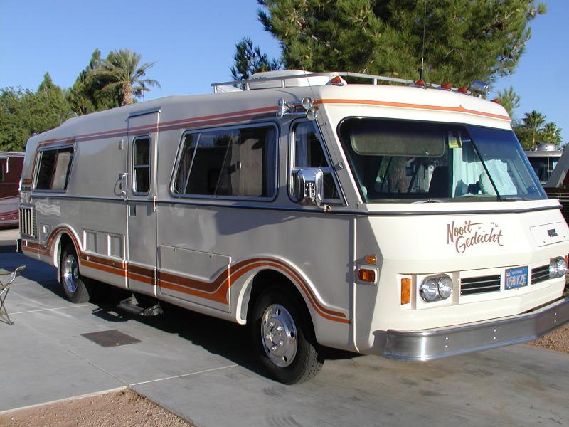 (1 Comments) This is George Vandersteen's coach, #487. I admired the very well done, unique paint job. George did the sanding and a local Hanford, CA painter did the actual painting. | George and his wife immigrated from Holland many years ago. In dutch, this is a saying loosely translated to mean something to the effect of "We never could have expectected it to be this good". It expresses their appreciation of the opprotunities they found here in the USA. | This is the DataStorm satellite antenna on my coach. #1046 is probably the only FMC with one of these. It is a coach of old with a space hat! A coach is as young as it's latest addition. | Coach at home. In the window is the "neighbor's" cat. Jane keeps the driver's window open so that the cat can come and go as she pleases. Jane has prepared a nest for the cat in the bedroom. During cold snaps, she keeps the heater on low. When the sun is out, the cat will sunbath on the dash. The cat complains when we take HER HOME and go somewhere with it. Most expensive cat home in the neighborhood! | ||
