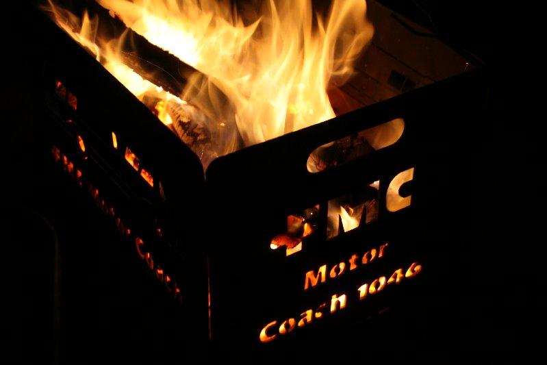 This is Greg Miller installing a new powered Fantastic vent on his coach. This replaced a very old non-powered vent. Coach 1046 also got a new vent installed in the bedroom. I didn't get a picture of us both on top of our coaches cleaning and scraping and discussing the best procedures to use to install the replacement vents, but that is the type of interaction that a Workday is all about. | .... and then the evening came and it was time to relax. | Here is an FMC Fire Box taking the evening chill out of the air. | The original and only FMC Club Fire Box was won by Denny Shewmake at the rally in Minden. I have since had one made with my coach number on the end. | ||