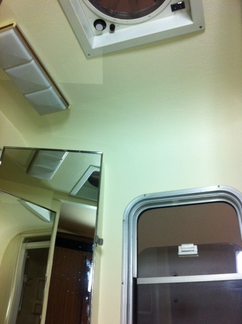 All the wiring front to back is finished so I could finally close up and seal off from underside the floor section between front wheels. Will add som rustproofing to the galvanized steel pan and some Styrofoam insulation before putting the floor back on top. | The automotive el is mostly done and the dash is back in. Time to do the bathroom interior and some plumbing before finishing up the rest of the interior. | (1 Comments) Stripped the vinyl wallpaper in the bathroom. | New housing for the black water holding tank was done before i did the flooring. | ||