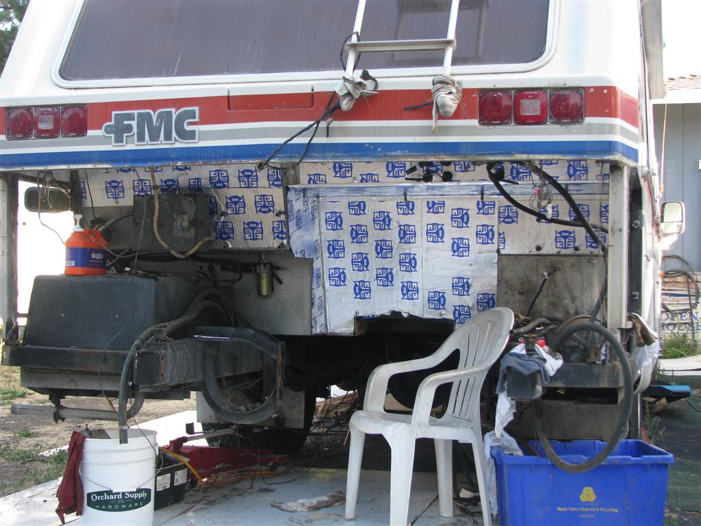 The FatMat will be installed on all of the surfaces that adjoin the interior of the coach which is everything except a section on the lower right and lower left. This will be covered with 1/4" of small cell foam board and then that will all be covered with a new 1/8" lining of sheet aluminum. There should be a major reduction in the engine and fan sound levels and a reduction in heat soak of the interior when stopping after a day's drive. | Here is the TURNING POINT! While a few more things are still being removed, here is the first new thing being installed. I have started the installation of the FatMat sound suppression material. | Here is the pair of Perma Cool coolers that have been removed. One was for the transmission and the other for the engine oil. They are the tube type with fins and were located under the propane tank behind the mud flap. I do not think they were very effective. The transmission cooler will be replaced by a stacked plate cooler in a different location with better air flow. | Almost everything is out. Cleaning up some wiring and then relining the firewall will start. | ||