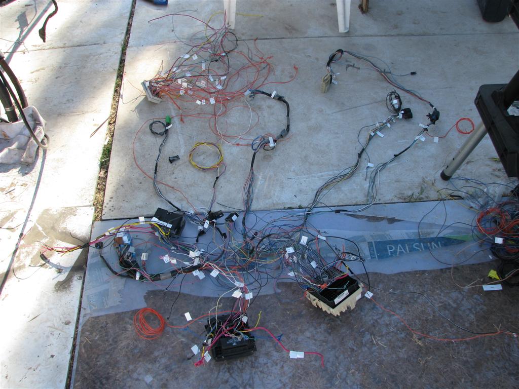 While the generator was going in, Eric continued sorting out the wires. Notice all of the little white spots. Those are tags that identify what each wire does. Those that are not needed are being clipped off and removed. | As discussed earlier, the vacuum source for my brakes no longer comes from the intake manifold, but from a mechanical pump run by the serpentine belt. Therefore, I was able to move the vacuum manifold that separates the front and rear brake systems down under the propane tank. I was also able to add a vacuum tank that will give me a reserve of vacuum should the engine stop. I will now be able to stroke the brake pedal several times after the engine stops and still have full assisted braking. | Remember all those wires in all those long harnesses. This is what it has been reduced to for this application as only the operational things are left. | It was convenient that the donor coolant overflow/pressure tank just fits right where the old radiator was. NOTE: Upon final fitment of the radiator, the pressure tank shifted to the left just under the edge of the cowling. | ||