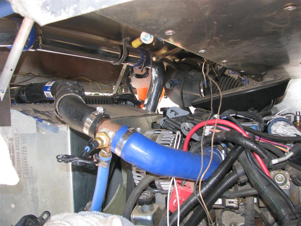 With the change from the GM radiator to the Ford radiator, the lower radiator hosing presented a challenge. It was resolved by cutting up the stock GM preformed hose and using two sections of it with a section of preformed hose secured off of the wall at Napa. The right hand section of blue hose has a molded in small hose that will become the return from the coach heater. The middle section has (on the back side) a molded in return line for the water cooled EGR valve from the engine. The black section to the left makes the bends and connection to the radiator outlet. | (1 Comments) Another view where you can see the connection to the radiator and the second small line for the return from the EGR valve. The coolant hose turns up and then connects to the mechanically driven water pump that sits low and to the right side of the engine. | This gives a little better view of the line coming back from the EGR cooler. A good flow through this line is important as the sensor for engine temperature is right where the coolant enters this system. Without good flow here, the ECM could receive incorrect temp readings and that would affect engine operation. | Back up topside, the upper radiator hose is now in place. Again, a trimmed off the shelf hose with the right bend was used to connect the radiator to the trimmed stock Duramax hose. | ||