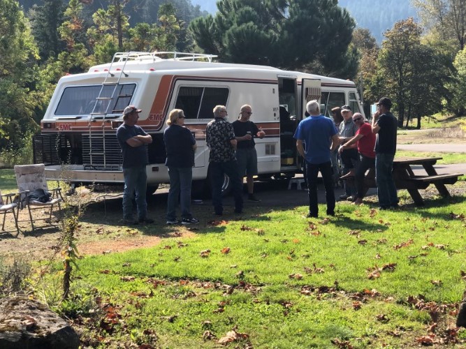 This is the Couple that came the furthest and had the most challenges getting to the rally. Frank and Suzzanne Borrmann, of Bluevale, Ontario, Canada who own coach 645 needed to get creative to get to the rally since the border was closed to non-essential travel. Frank found out that while they couldn't cross the border with their coach, they could fly to Seattle, rent a van to attend the rally and then return the van and fly back home. That's how important rallies are to some coach owners! While the van was the cause of some ribbing, their coach is beautiful and immaculately maintained. Hopefully at the next one they can bring their FMC. | Coach 386, the Grape, in the rear and 708 up front. | The evening gathering spot. | Coach 708, owned by Greg Miller the newly elected FMC Owners Club President. | ||