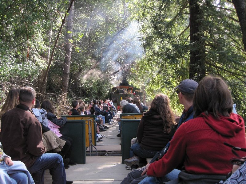 Here we are on our way back with Mr. Cool, Eric Whedon, at the wheel of coach #587. He did a good job and he never spilled a drop from the cup of water on the counter. | While some were looking for whales, others took a ride on the narrow guage steam train that is located in the adjacent state park. They went up into a grove of redwoods amd learned some facts and history relating to redwood trees. | Yes, it does look like a toy train and trestle, but if you were riding in the car you didn't at that point want to know how old that trestle actually is or how many tons of logs were transported over it! | Note that this engine is a wood burner and has the verticle side steam pistons. That type of engine has high low speed torque for hard work. | ||