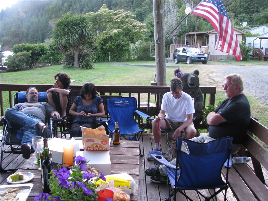 Here is a patch of wild rubarb. Time to gather some for a rubarb pie! | ... and another bald eagle. This is how they looked to us without camera zoom. If you can't see it, then ... | ... look here in this picture where I zoomed in to show it better. | After most of the day on the river, we returned to the rally site and relaxed and got ready for snacks and dinner. Here we have Greg Miller, Gage Miller, Nuntawan Camrye, Carlton Camrye and Larry Enoksen. | ||