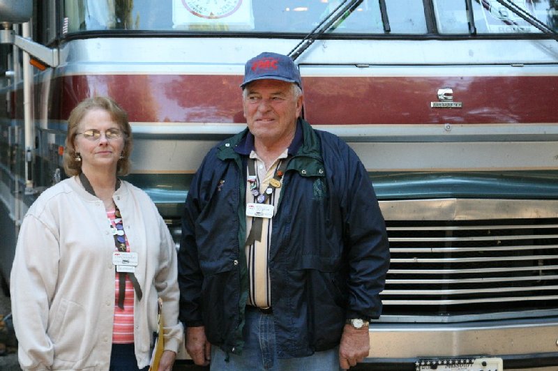 And now for formal introductions: in coach numerical order here we have Cliff Cappos with a unique logo on the front of #0002 followed by .... | ...Brian Gorman and Vivian Terry standing in front of a coach that looks like their #027 (which wasn't mechanically inclinded this time) and then ... | ....Frank "Paco" and Mary Lou Ruiz with recently repainted #059. We then move on to .... | ...Lynn and Ken Clugston who came west from MO in their Vogue as #268 had a wounded right front spindle and couldn't make the trip on three wheels. It is important to note that the Clugstons attend rallies in what ever vehicle will get them there. Last summer it was their van. Next up is our members from Oregon .... | ||
