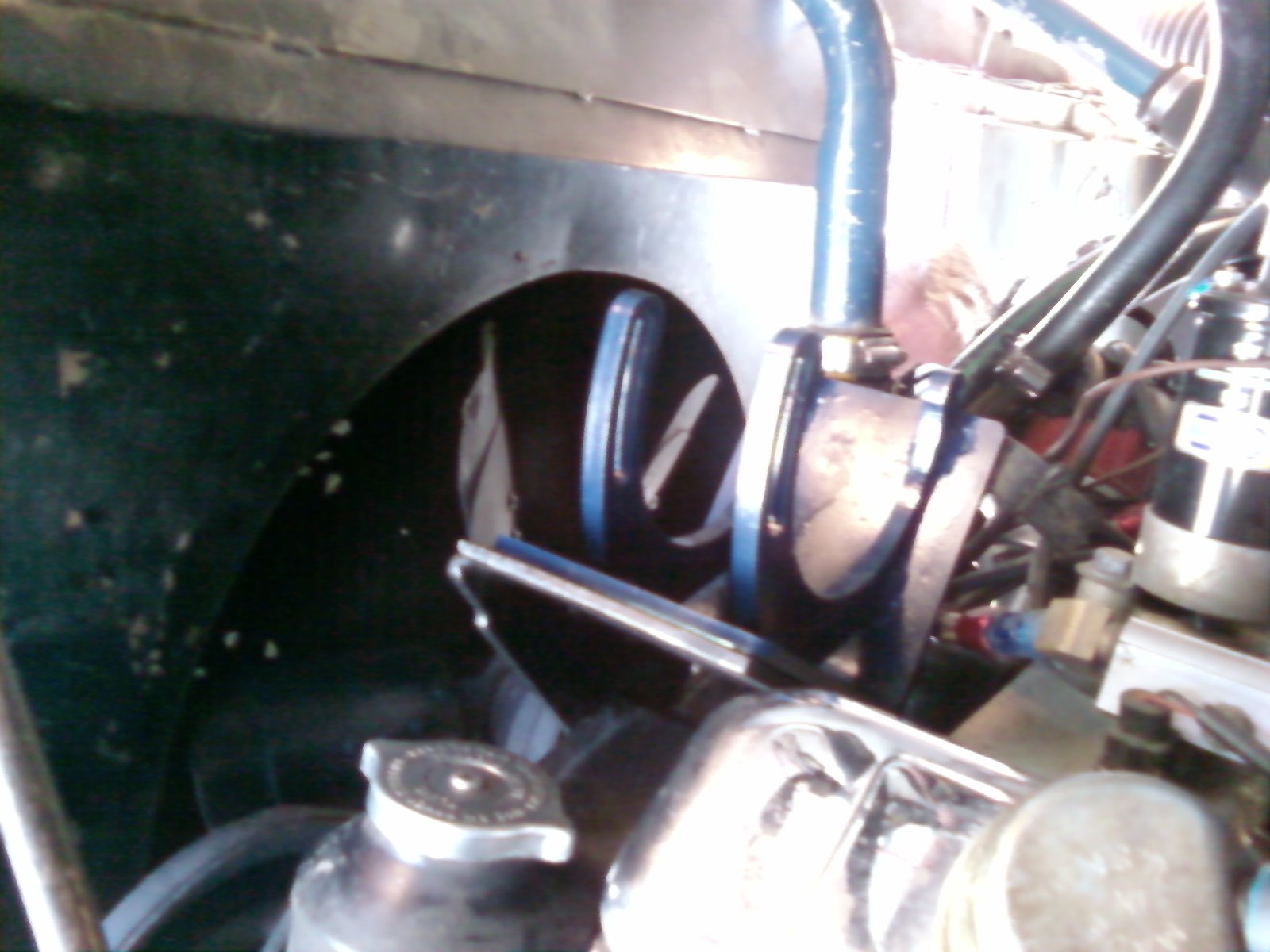 Here you see the initial fitting. The bolts that attach the bracket to the original bracket are in place and the belts are on the pulley. In this case the orignial belts were able to be used, but slightly longer belts would be better.